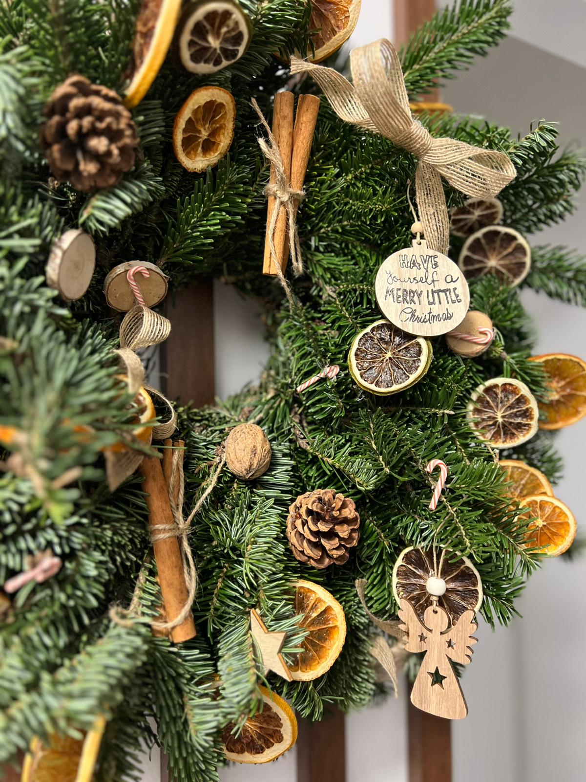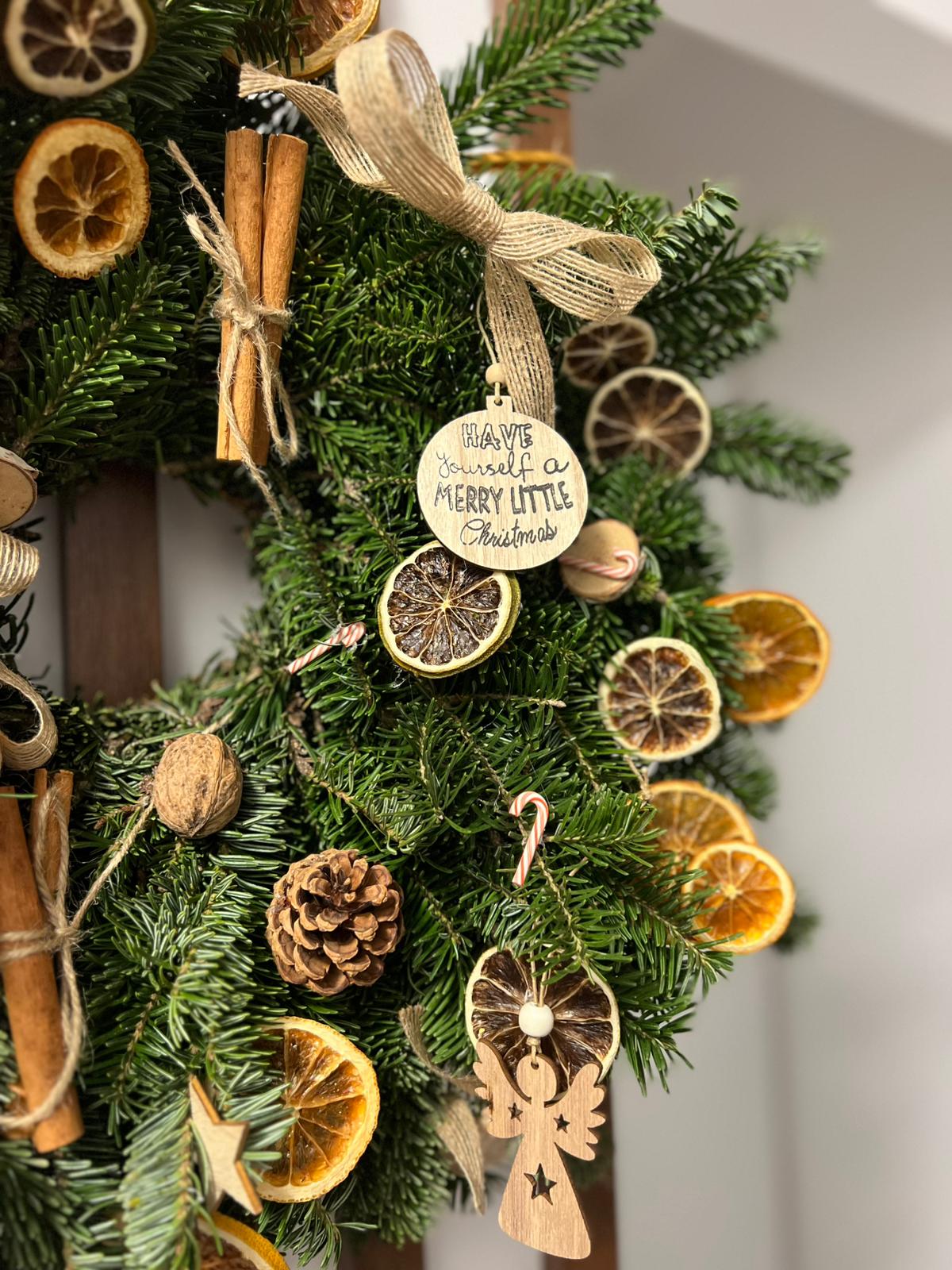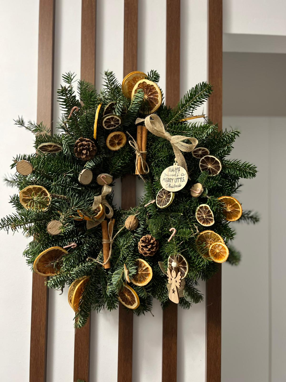 un șoptit cald de sărbătoare, un amestec irezistibil de brad proaspăt, felii de portocală uscată, bețe de scorțișoară și accente naturale care spun „Aici e acasă”.