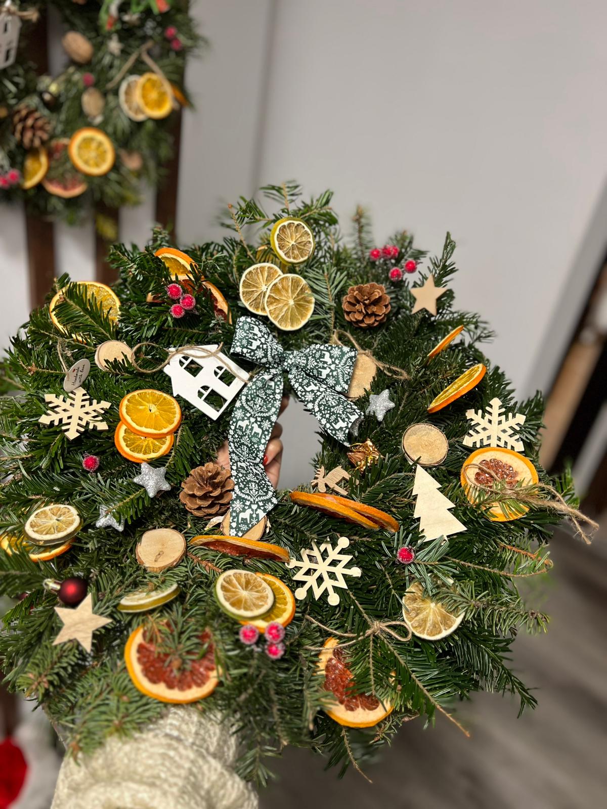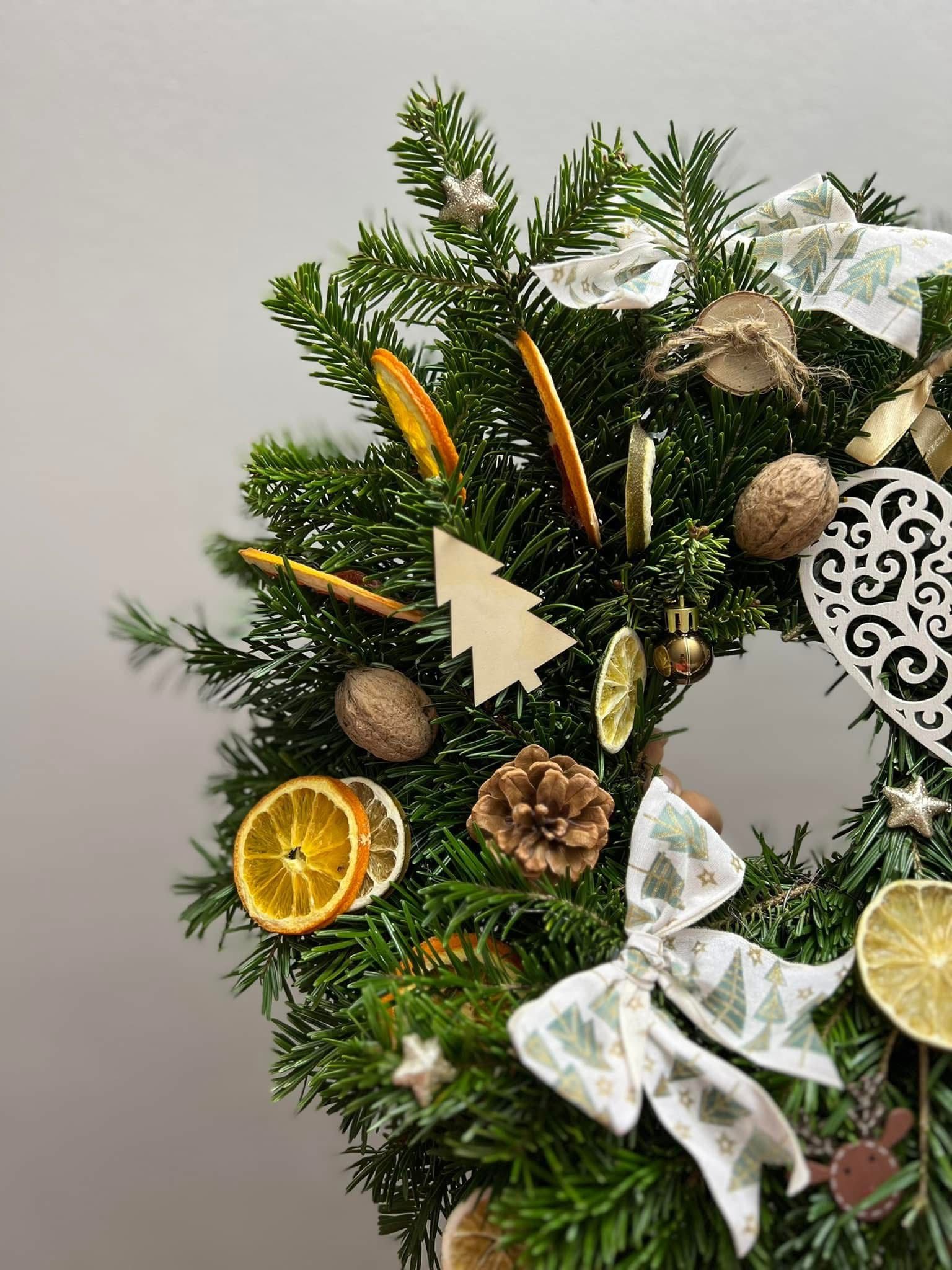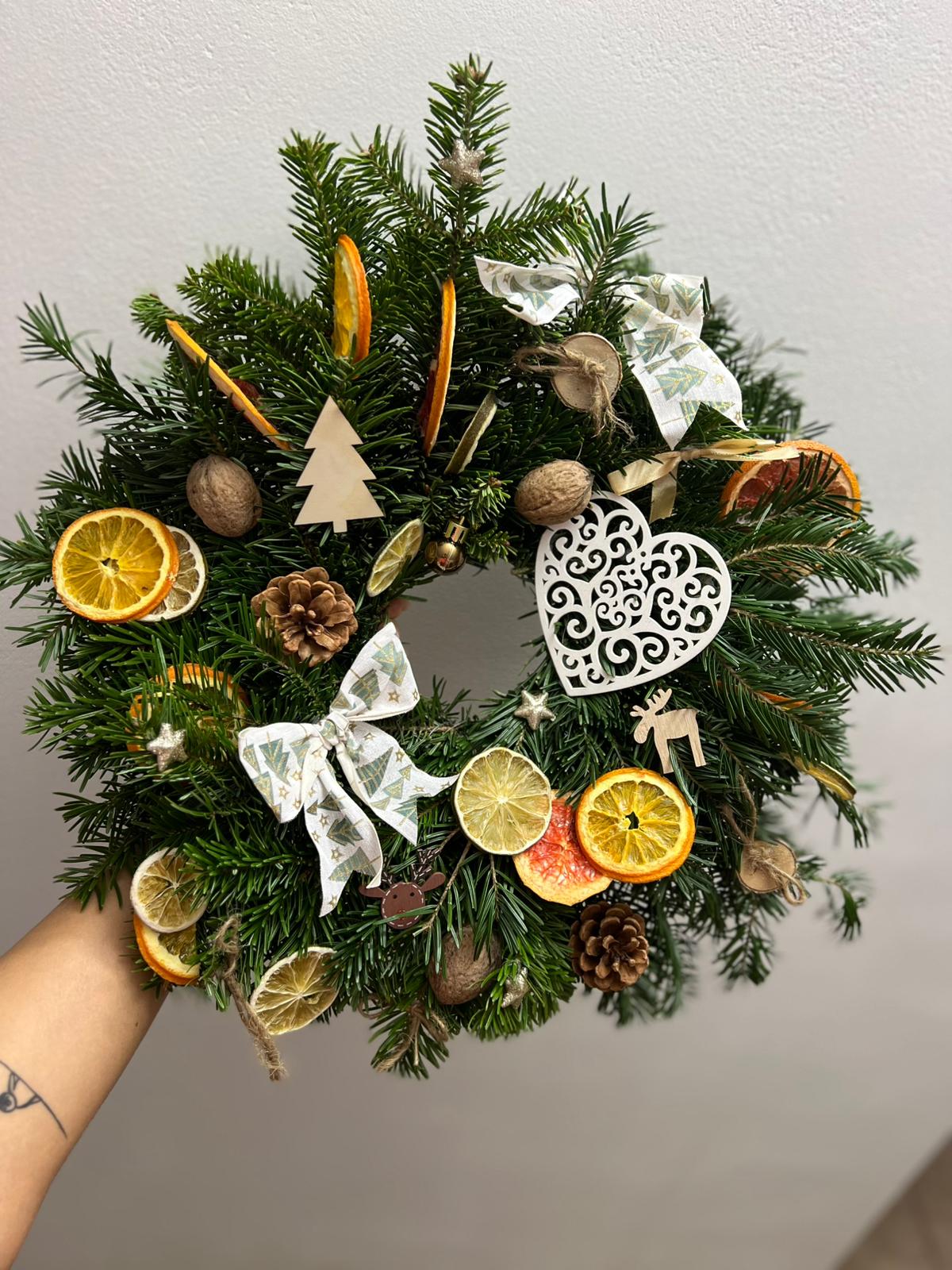 Realizată din brad natural, cu felii aromate de citrice, nuci, conuri, stelute delicate și un inimioarӑ filigran care devine centrul întregii povești, această coroniță este despre acasă, iubire și timp pentru ce contează.